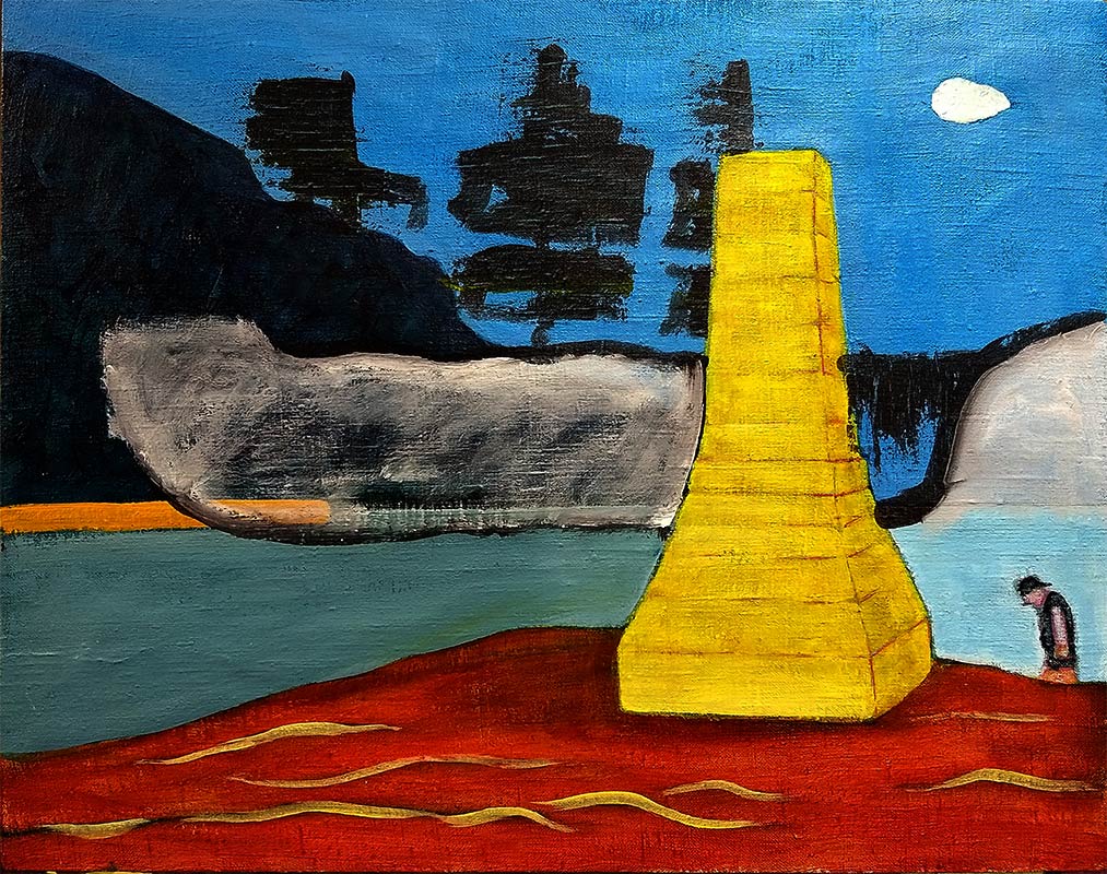 Previous Image Next Image ©Schwab2018 Memorial, 50x60cm, acrylic on linen Memorial painted from a photo of a Cook memorial, cooks landing place, Kurnell