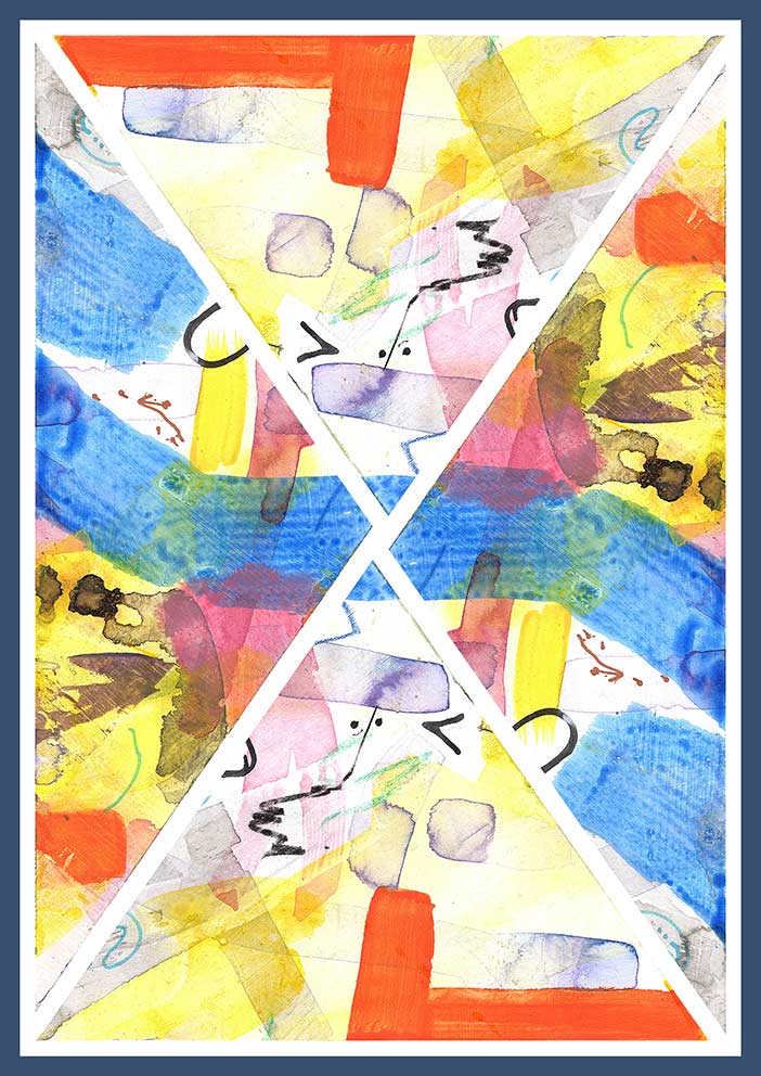 Two triangles from the scanned set, they were placed on the scanner in a random way, then in photoshop were duplicated and flipped to create this intriguing harmonious work.