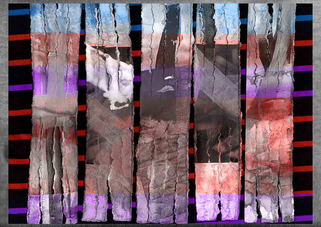Producing a forest like impression these ‘torn papers’ were scanned into photoshop, after being painted then stained with ink using my experimental non-objective, chance processes to make images. This set of 5 shows the full length of the stripes each 22x5cm